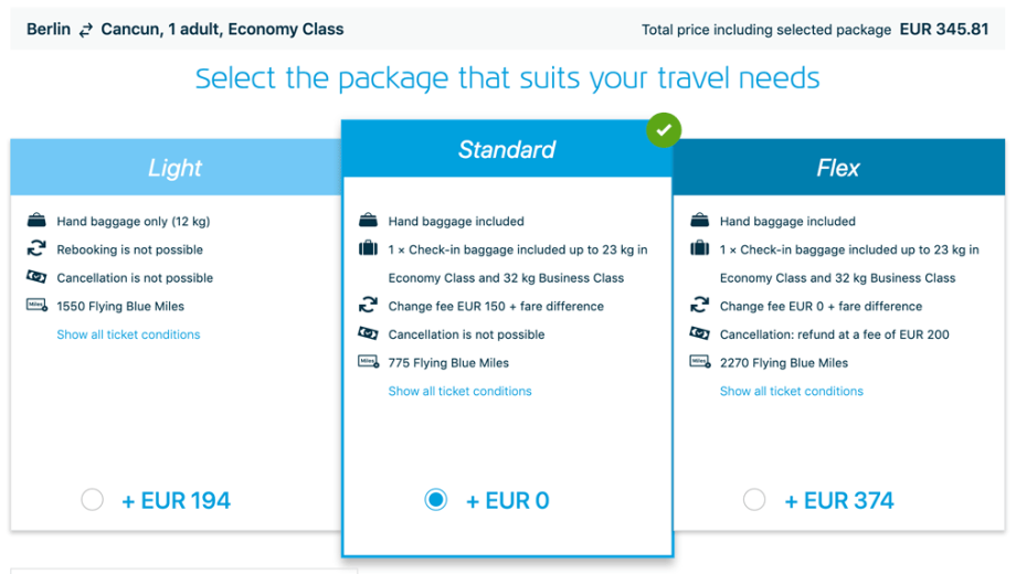 A po dalším prokliku? Web KLM se chová tak, že po prvotním výběru ukazuje cenu vyšší, avšak automaticky v tarifu Light, který je v tomto případě mimořádně dražší. Stačí kliknout dál a dostanete se k výběru tarifu Standard, který je za deklarované ceny.