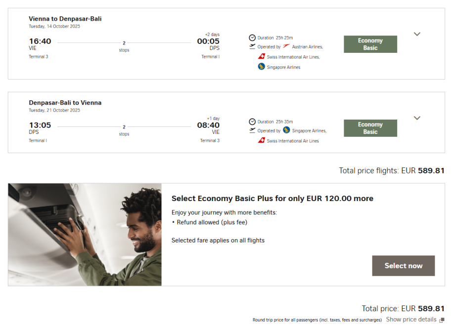 Další možností je let se Swiss, s přestupy v Curychu a Singapuru. Cena zpáteční letenky je 14 730 Kč a termíny jsou dostupné v říjnu, listopadu 2025 a lednu 2026.
