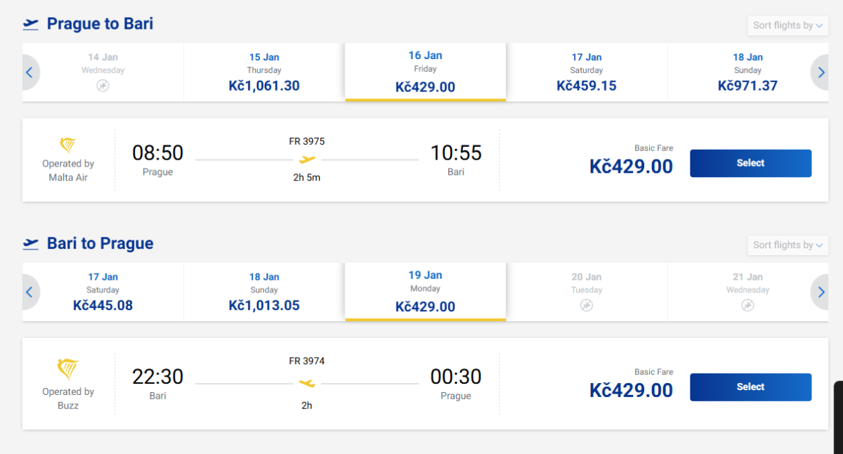 Odlety z Prahy vycházejí podle termínu buď v ranních hodinách, nebo večer v 18:10. Odlet z Bari je ve všech uvedených termínech ve 22:30.