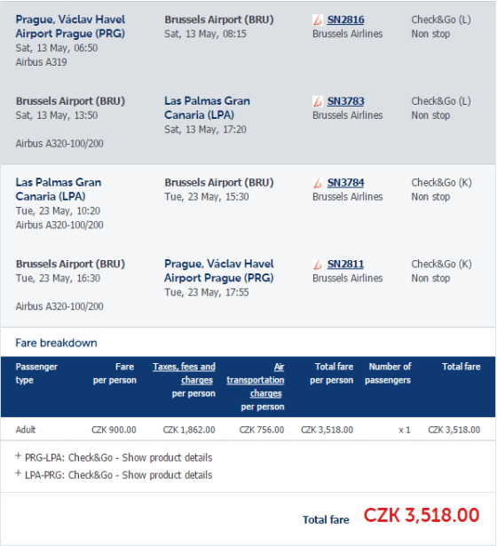 Využijte skvělé nabídky společnosti Brussels Airlines s odletem z Prahy na Kanárské ostrovy. Za zpáteční cestu do Las Palmas na ostrově Gran Canaria zaplatíte 3.518 Kč s 12 kg příručním zavazadlem, budete-li chtít přibalit větší odbavené, zaplatíte celkem 4.326 Kč.
