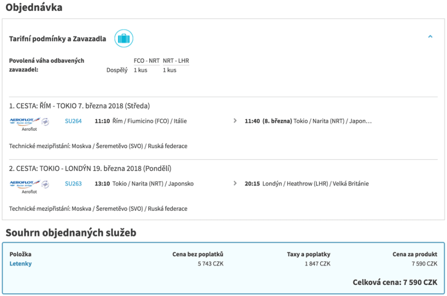 Nejen zkušení cestovatelé mohou využít levných letenek do Tokia na křídlech ruského vlajkového dopravce Aeroflot. Ten v rámci trasy Řím–Tokio–Londýn nabízí omezený počet letenek za 7.590 Kč, což i po započtení nezbytných výdajů na přískoky nepřesáhne hranici 10.000 Kč, pravděpodobně však méně.