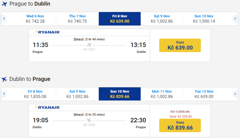 K podzimní cestě za pravými irskými puby láká Ryanair svými zlevněnými víkendovými letenkami z Prahy do Dublinu. Během listopadu pořídíte na různě dlouhé termíny včetně prodloužených víkendů za 1 478 Kč, přičemž ti nejrychlejší z vás, kteří si akci přečtou ihned po zveřejnění, mají šanci ulovit letenky ještě o 200 Kč levněji. Za 1 278 Kč však u každého termínu zbývají už jen 2 volná místa.