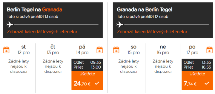 Nejlevnější zpáteční letenky z berlínského letiště Tegel přímo do Granady seženete za 32,50 € / 840 Kč při cestě dvou osob. (Čím více poletí, tím více se snižuje cena - administrativní poplatek se rozpočítává mezi všechny cestující). Na ranní odlet do Berlína se kromě vlastního auta nejsnáze dopravíte nočním Flixbusem za 599 Kč, večerní návrat domů pak obstará Regiojet za 390 Kč.