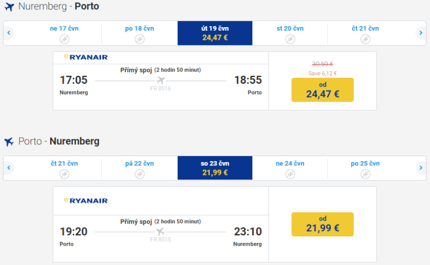 Omezenou zlevněnou nabídku na červnové termíny a jejich různé kombinace nabízí Ryanair z německého Norimberku do jednoho z nejlepších evropských měst Porta. Zatímco na zimní období se obyčejně letenky dají sehnat ještě levněji a na mnohem více termínů, v hlavní sezóně bývá dostupnost bídná a ceny mnohem vyšší.
