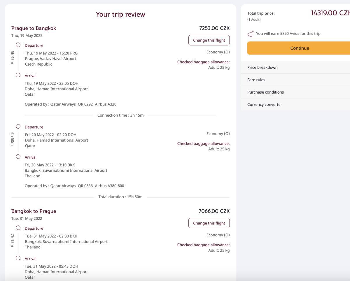Dnes se poprvé od zdražování objevily letenky za „normální“ ceny. Z Prahy do Bangkoku na křídlech prémiových aerolinek Qatar Airways poletíte za 14 319 Kč. Při volbě letu zvolte tarif Classic zahrnující 25 kg zavazadlo a dvojnásobný počet věrnostních bodů Aviosů. Je o pouhé 2 Kč dražší, než tarif Lite. Délka přestupu v Kataru je pouhé 2 a půl hodiny.