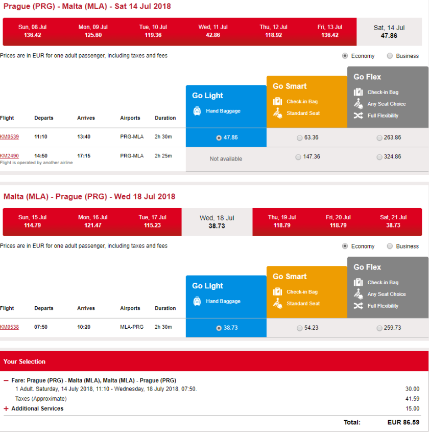 - Malta -> Praha: 7, 18, 21, 25, 28 a 4. srpna