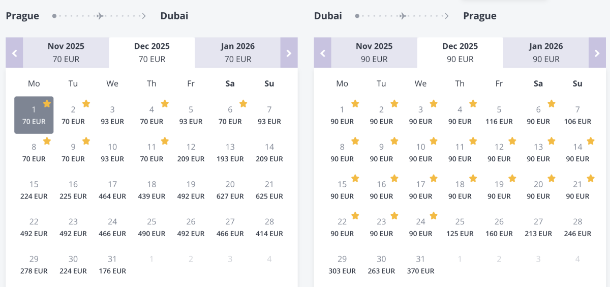 Velmi výhodné letenky z Prahy do Emirátů pořídíte na křídlech aerolinií Pegasus. Ty nabízejí zpáteční letenky do Dubaje za 159 EUR, a to na spoustu termínů převážně během prosince, sporadicky pak od listopadu až do března.