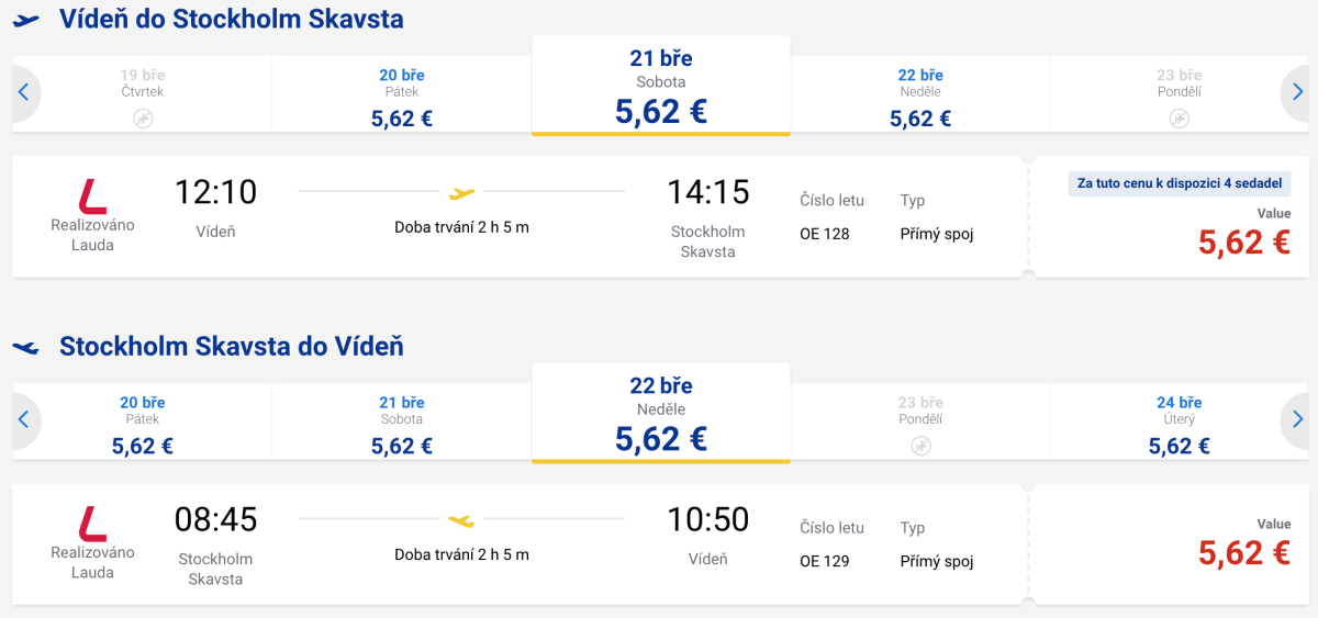 Aktuálně najdete zlevněné letenky na měsíce únor a březen. Některé destinace mají termínů pomálu. jiné téměř na každý den jako třeba Stockholm, který umožňuje i víkendové otočky od soboty do neděle.