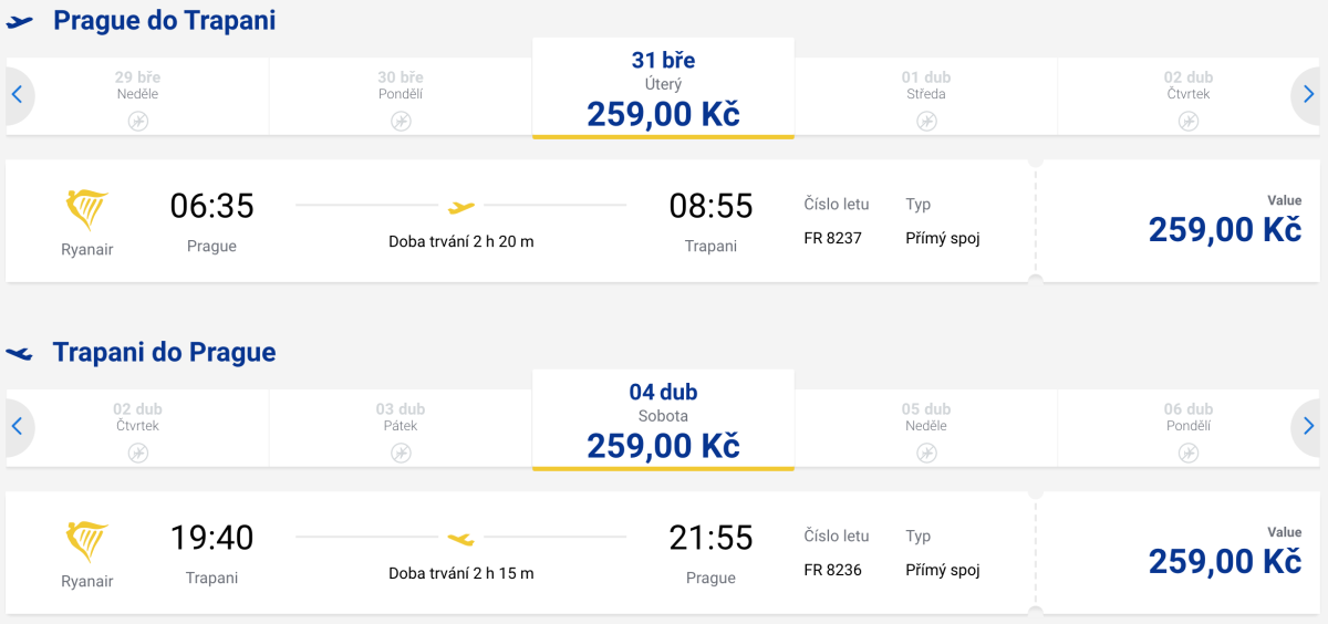 Co první týden v dubnu? Leťte na Sicílii do přímořského letoviska Trapani v jehož blízkosti si můžete udělat výlet na solná pole či vyjet lanovkou na horu Erice a stejnojmenného historického městečka. Pokud vám termín od úterý 31.3. do soboty 4.4. vyhovuje, na nic nečekejte. Letenek za 543 Kč je sice aktuálně více než 9, ale tato cenovka jistě dlouho nevydrží. Na všechny ostatní termíny jsou ceny okolo 3 tisíc.