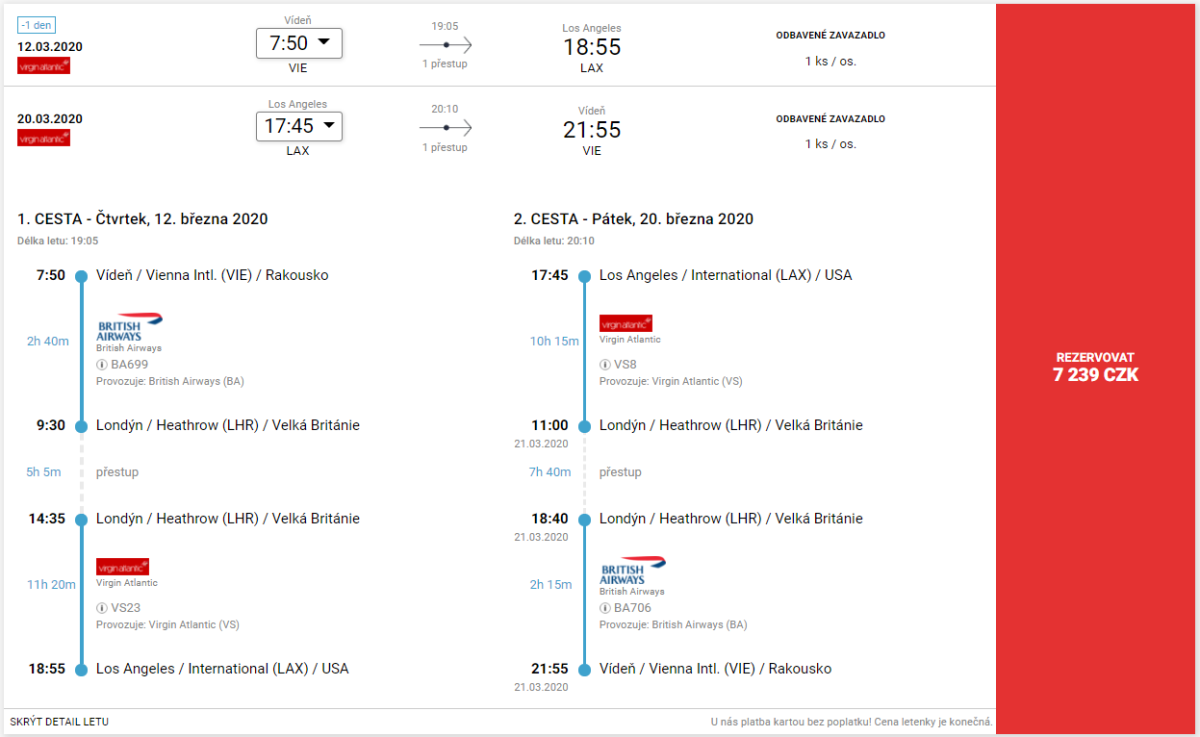 Ačkoliv v rezervačních systémech najdete i o několik stovek levnější letenky, tak níže uvedené lety se společností Virgin Atlantic vyjdou pro některé z vás mnohem levněji. Háček je totiž v odbavených zavazadlech. Většina aerolinií už na letech do USA odbavené zavazadlo v ceně nemá a musíte si jej tak minimálně za 100 EUR dokoupit.