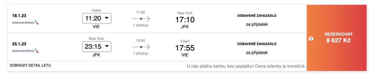 Lety jsou operovány s jedním přestupem v Londýně. Pokud si pomůžete filtrací u výsledků, vyběhnou vám krátké lety s celkovou dobou letu 12 hodin v obou směrech. Mnohdy najdete pak letenky i z 7 667 Kč, které však zahrnují přestup mezi letišti a jsou proto označeny vykřičníkem. Finančně se nevyplatí.