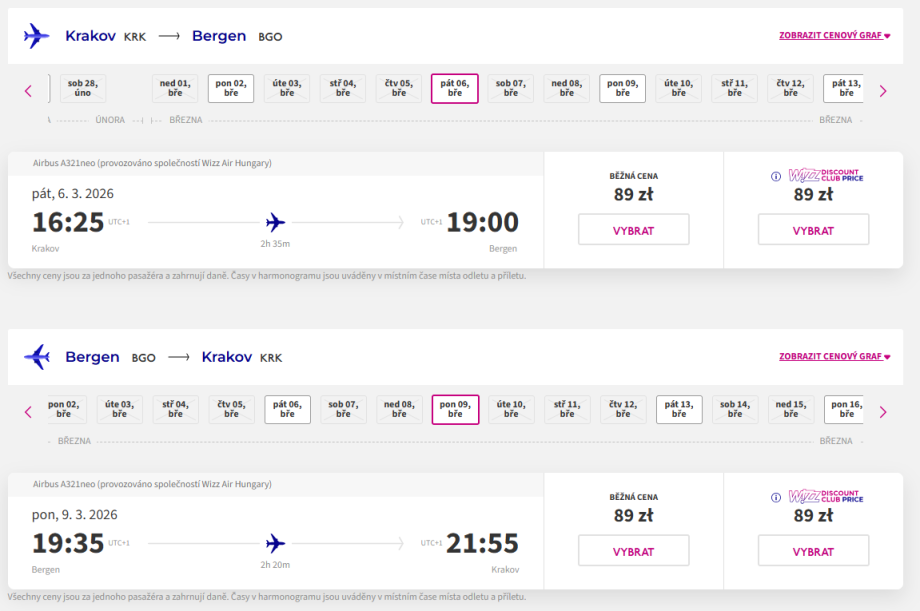 Wizz Air aktuálně nabízí výhodné zpáteční lety z Krakova do norských měst