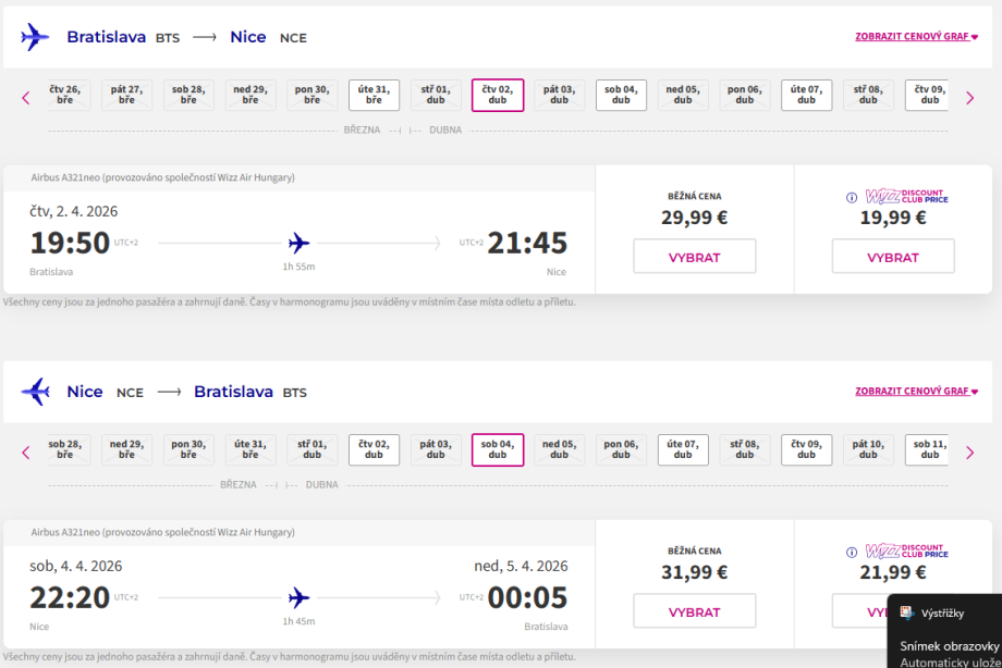- Bratislava - Nice: 19:50–21:45