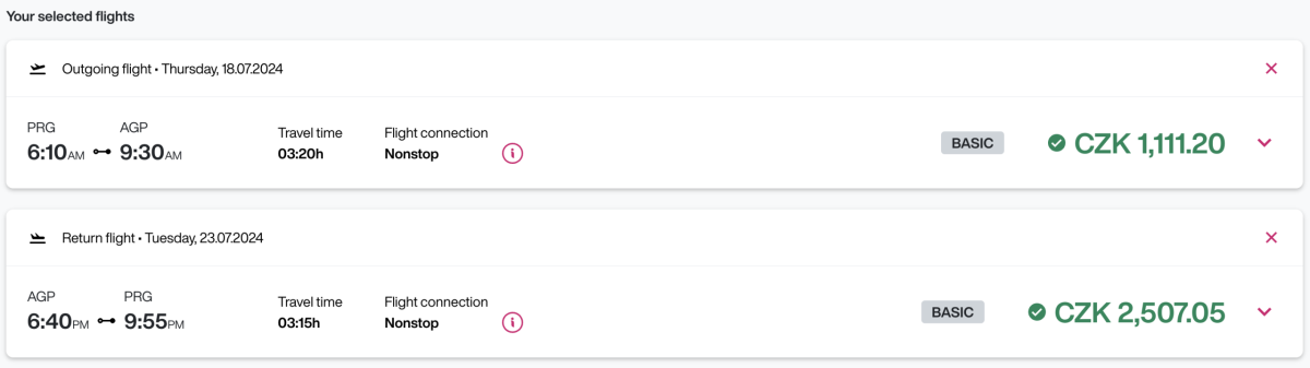 Výhodné zpáteční letenky z Prahy do Malagy pořídíte po čas léta, a to i na letní prázdniny. Nejlevnější termín za 2 998 Kč vychází na červen v termínu 12. - 19., za 3 618 Kč pak v červenci ideálně od čtvrtka ráno do úterý večer 18. - 23. a 25. - 30. Termínů do 4 tisíc ale najdete vícero v přehledném kalendáři na stránkách aerolinií eurowings.com.