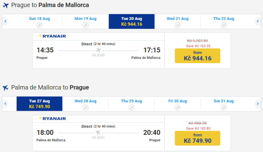 Individuální letenky z Prahy na ostrov Mallorca byly dlouhou dobu pod monopolním palcem SmartWings, letos však dochází ke změně, kdy od června na této trase začne létat Ryanair. A první výsledky se už dostavují. Zatímco v minulých letech se zpáteční letenky o prázdninách jen zřídkakdy daly sehnat pod 6.000 Kč, dnes můžete na dva týdenní srpnové termíny zakoupit letenky za 1.694 Kč. A to už je cena, při které se příliš nevyplatí jezdit ani za "letenkami za pětikilo" z Německa či Rakouska... Je otázkou, zda od Ryanairu na trase z Prahy můžeme čekat ještě nižší cenu, každopádně platí, že pokud se na Mallorcu chcete vypravit a jindy než o prázdninách to nelze, cokoliv pod 2 tisíce je skvělá cena.