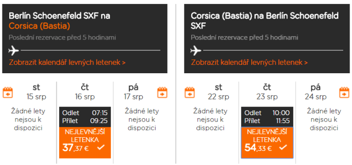Po minulých letech levných letenek Eurowings na Korsiku, letos pravděpodobně přichází útlum, když všechny přímé lety z Vídně i Mnichova zmizely ze systému. Naštěstí je tu stále fungující alternativa v podobě easyJetu a letů z berlínského letiště Schönefeld do Bastie, druhého největšího korsického města. Zpáteční letenky startují na 2.335 Kč při rezervaci alespoň dvou osob, na více termínů pak narazíme na cenu kolem 2.400 Kč, což i s dopravou s Prahy do Berlína dá maximálně 3.500 Kč a to je na prázdniny skvělá cena. Kombinace low-cost letenek z Prahy o prázdninách vyjde minimálně na 5.500 Kč. Jedinou další alternativou je cesta autem do Janova či Piombina a odtud lodí na Korsiku.