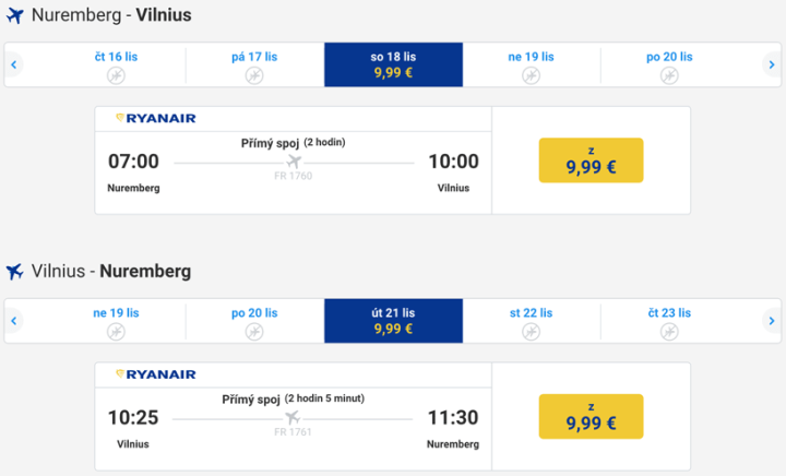 Ačkoliv je Litva prakticky za polskými humny, cesta sem bývá buďto časově náročná nebo ekonomicky nevýhodná. Jistý kompromis pak přináší zvýhodněné letenky společnosti Ryanair z Norimberku do Vilniusu, kdy lze zakoupit zpáteční letenky na nejbližší týdny za 20 €.