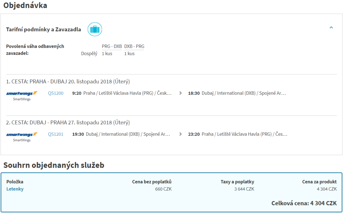 Letecká společnost SmartWings postupně uvolňuje do prodeje zlevněné letenky na svých přímých spojích mezi Prahou a Dubají. Aktuálně jsou k mání zpáteční letenky s bezkonkurenční cenovkou 4.305 Kč prakticky na celý listopad, přičemž nejlevnější lety jsou v úterý a pátky, zpět pak především v úterý.