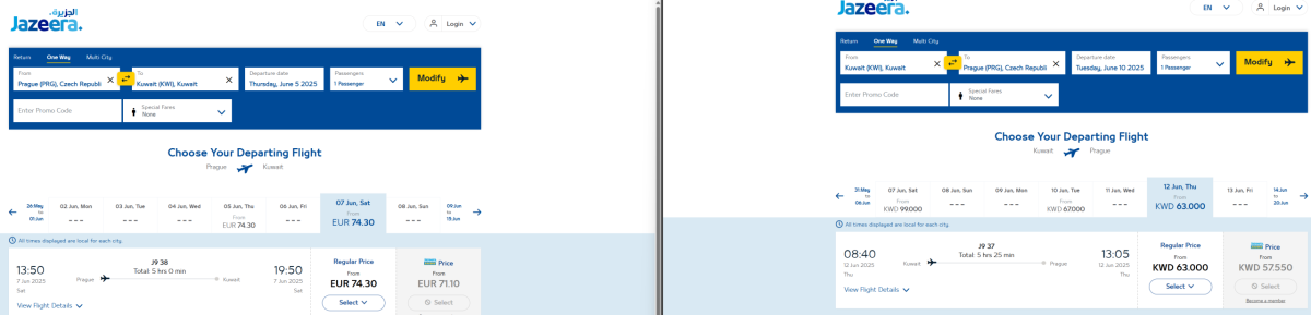 Díky dvěma rezervacím jednosměrných letenek se cenově dostanete na částku od 74,30 EUR cestou do Kuvajtu a od 62 KWD na cestu do Prahy třeba od soboty do čtvrtka. Letenky jsou tedy k sehnání od 6 289 Kč.