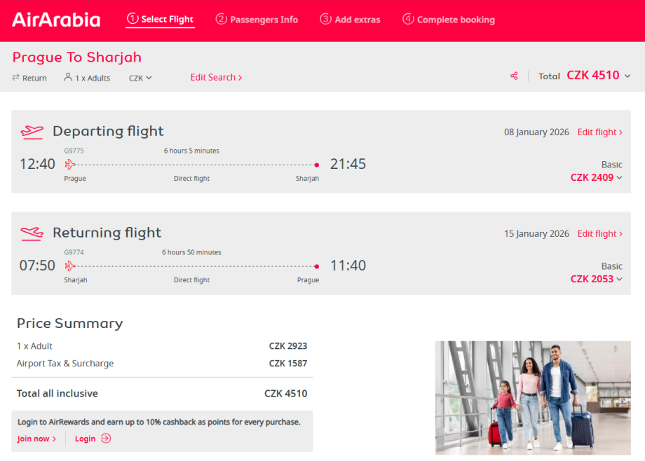Letecká společnost Air Arabia znovu nabízí akční zpáteční letenky z Prahy do Šardžá za 4 510 Kč.