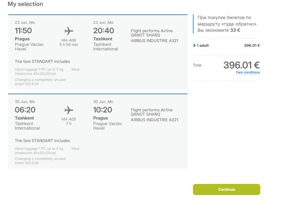 HH405 Taškent 6:20 – Praha 10:20