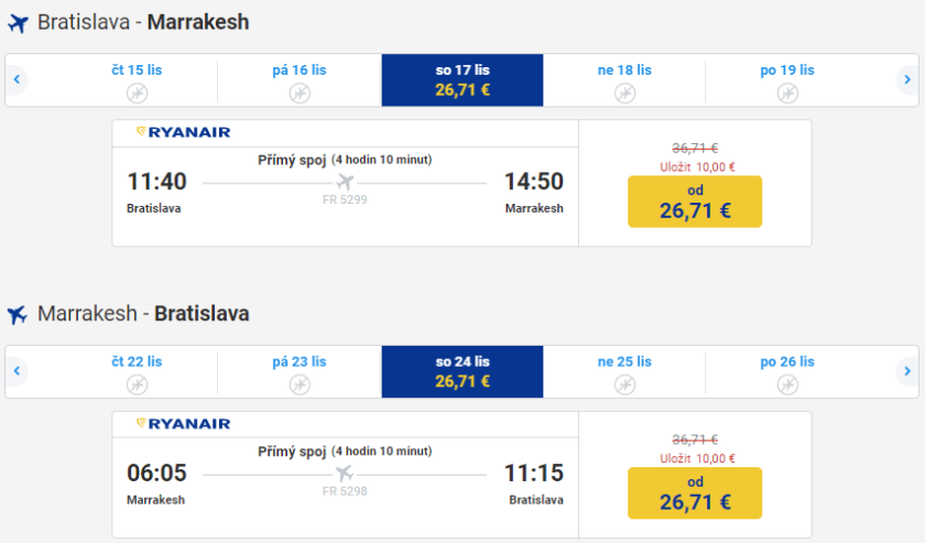 S napětím očekáváme snižování cen na nových linkách z Bratislavy i Prahy do nejznámějšího marockého města Marrákeš, které startují koncem října. Zatímco ceny z Prahy se tvrdošíjně drží nad hranicí 2.500 Kč za zpáteční letenku, z Bratislavy spadly na 1.375 Kč, konkrétně tedy 53,42 €. A to už je cena, nad kterou se rozhodně nemusíme dlouho rozmýšlet.
