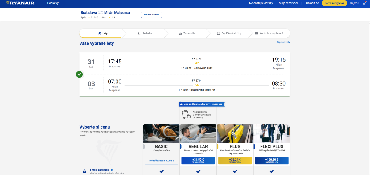 Létá se denně kromě středy a v ceně základního tarifu Basic je pouze malé příruční zavazadlo určené k umístění pod sedadlo před Vámi.
