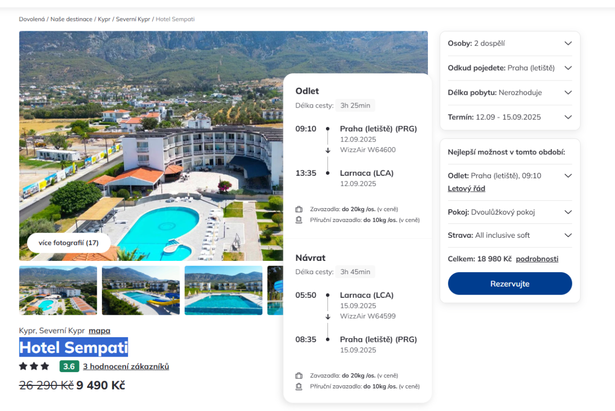 V ceně zájezdu jsou 3 noci s all inclusive soft, letenka z Prahy v termínu 12.–15. září a odbavené zavazadlo do 20 kg.