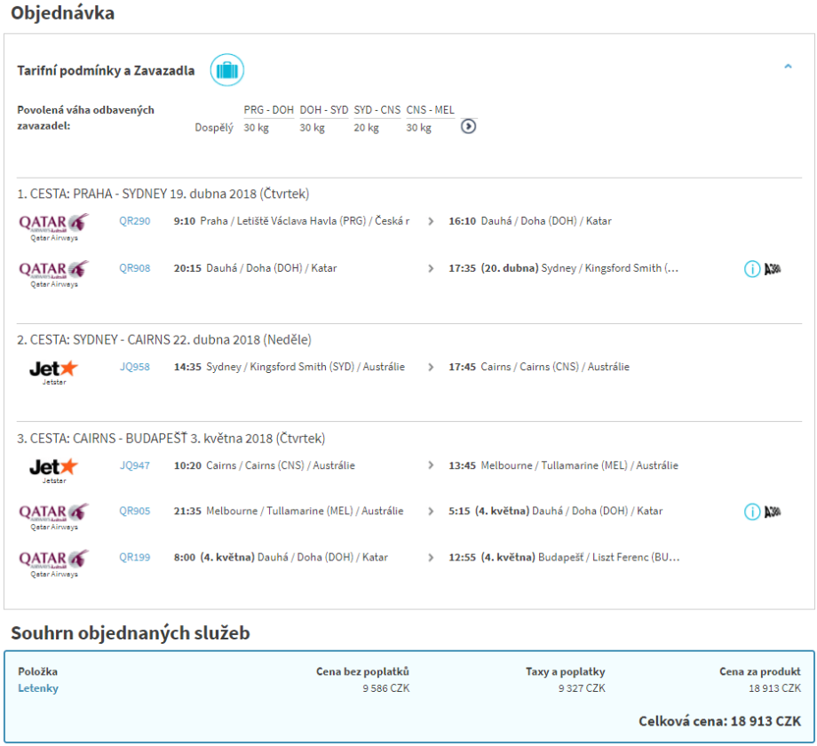 - Praha – Sydney (SYD) – Cairns (CNS) – Budapešť