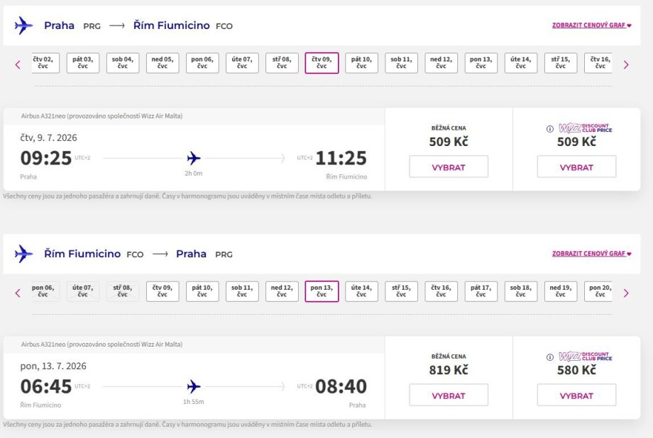 Levné letenky z Prahy do Říma pořídíte i během letních prázdnin. Na červenec má Wizz Air akci, díky které koupíte zpáteční letenky už za 1 199 Kč, například v termínu 9.–12. 7., ale i v dalších vybraných termínech.