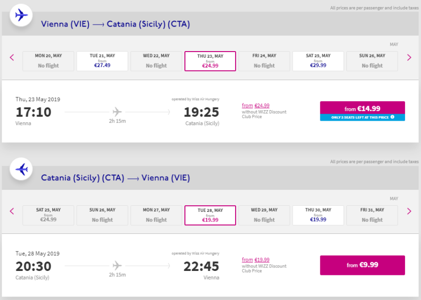 Nejlevnější zpáteční letenky při členství ve WDC, které se vzhledem k rozsáhlé síti Wizz Airu z Vídně a Bratislavy určitě vyplatí (minimálně těm, pro které je vídeňské letiště první volbou), začínají na 25 EUR. Pokud členy nejste a cestujete ve dvou lidech, vyplatí se zakoupit už při této první cestě. Jedna zpáteční letenka tak vyjde na 40 EUR.