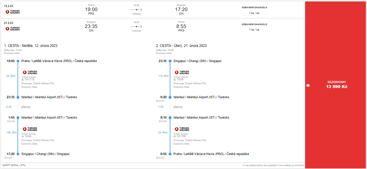 Zajímavou možností jsou i open-jaw letenky z Prahy do Singapuru a zpět z Bangkoku do Prahy za 13 867 Kč. Samozřejmostí u Turkish Airlines je přeprava odbaveného zavazadla zdarma.