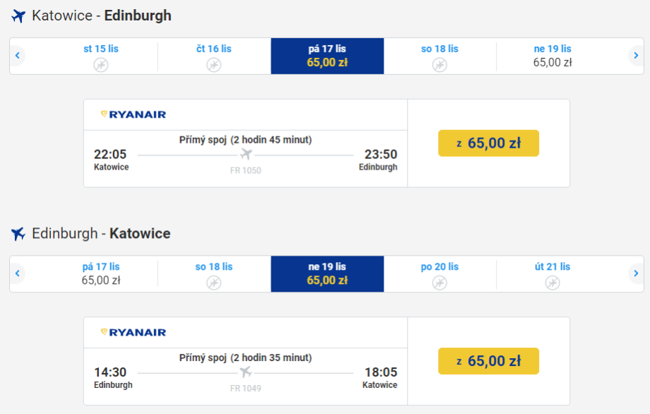 Před nedávnem jsme s velkou radostí avizovali levné letenky z polských Katovic do Edinburghu ve Skotsku za cenu 130 zlotých v obou směrech. Tyto letenky jsou aktuálně opět dostupné, tentokráte ovšem na téměř všechny víkendy během listopadu a prosince, vánoční období a Nový rok je však mimo hru. Chcete-li vyrazit za poznáním tohoto krásného historického přímořského města, dlouho se nerozhodujte, letenky jsou obvykle velice rychle rozebrány.