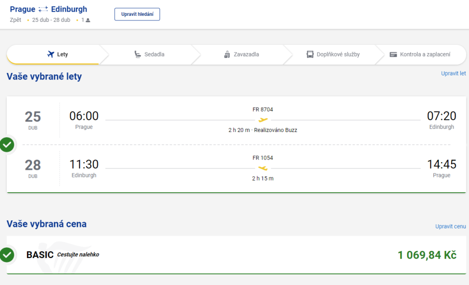 Letenky z Prahy do Edinburghu se cenově tradičně pohybují v řádech kolem 3 500 až 6 000 Kč. Proto nás velmi zaujalo ojedinělé datum na konci dubna v rezervačním systému Ryanair za 1 070 Kč.