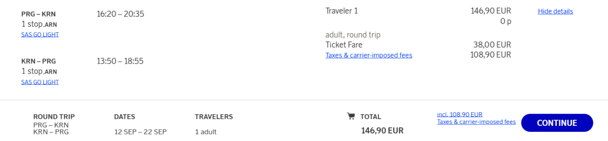 - V ceně je malé příruční zavazadlo 40×30×15 cm. Tarif SAS Go Smart s odbaveným zavazadlem za 181 EUR