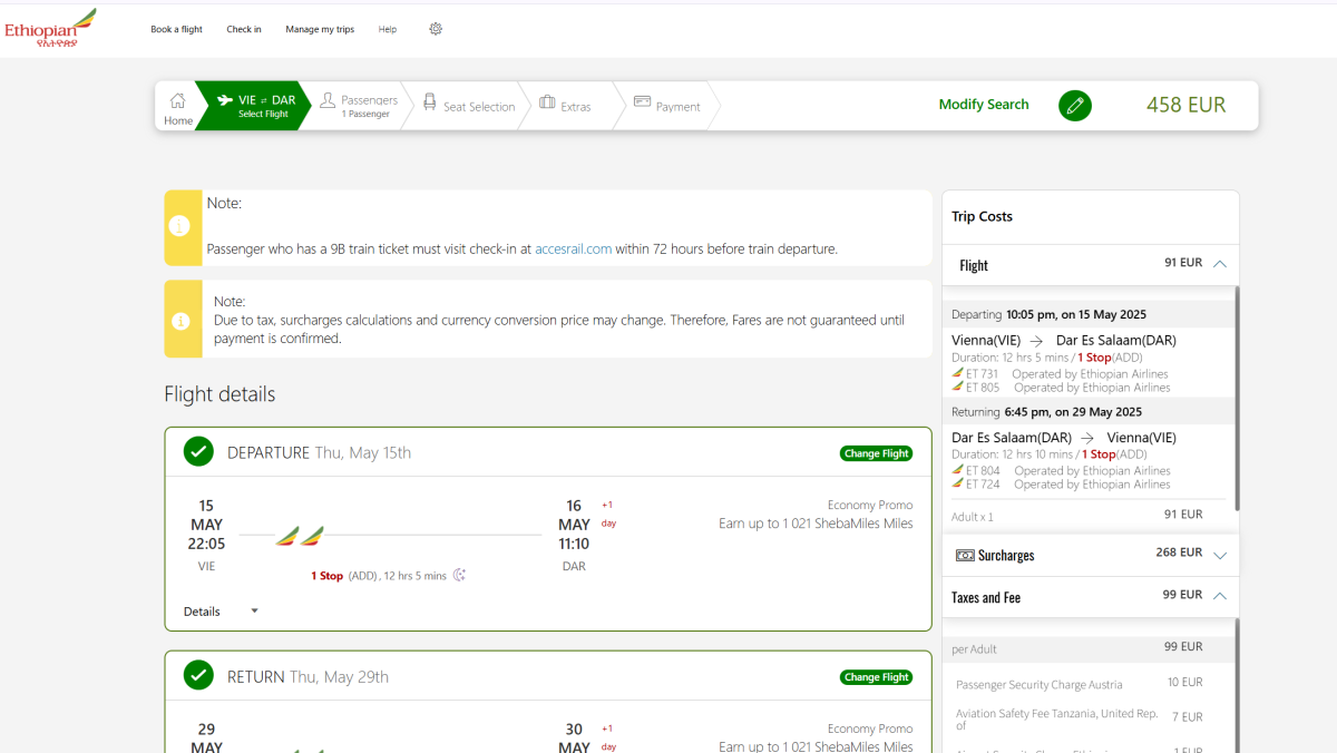 Lety jsou operovány s jedním krátkým přestupem na letišti v Addis Abeba, ale existuje i možnost celodenního přestupu, který vychází na 82 EUR za jeden směr. Během letů je podáváno jídlo i nápoje a během přestupů nabízí Ethiopian Airlines za určitých podmínek hotel zdarma.