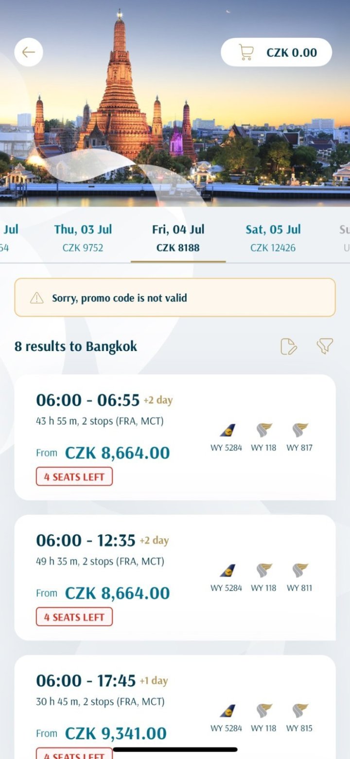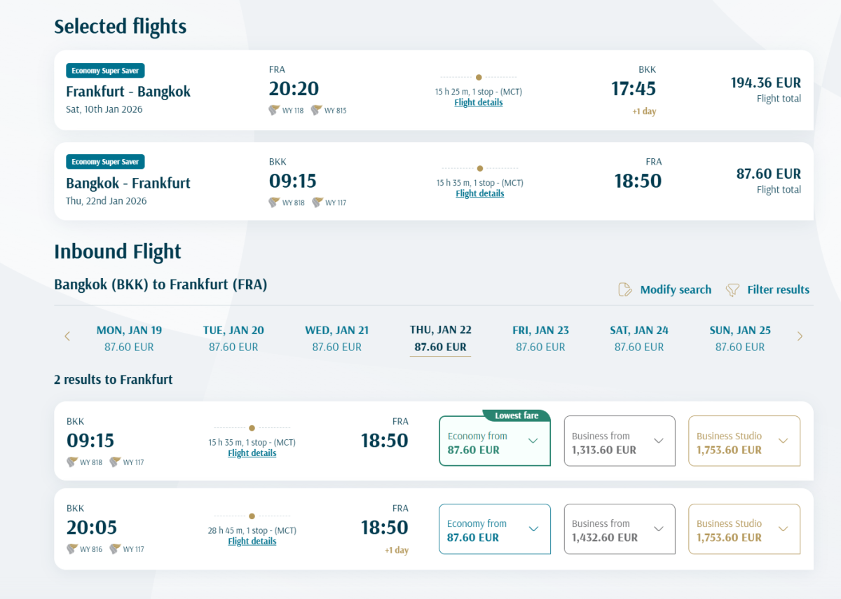 Zároveň zjevně vyprodali kapacitu případné akce - letenky nyní nejsou k dispozici, i když dnes odpoledne ještě byly. Ale Frankfurt - Maskat a Maskat - Bangkok jsou prodejné. Error? Marketingový tah? Ale zatím co o jiných Errorech Ománců jsou články všude po netu, tady o tomhle jich moc není (vidím to jen u Němců...).
