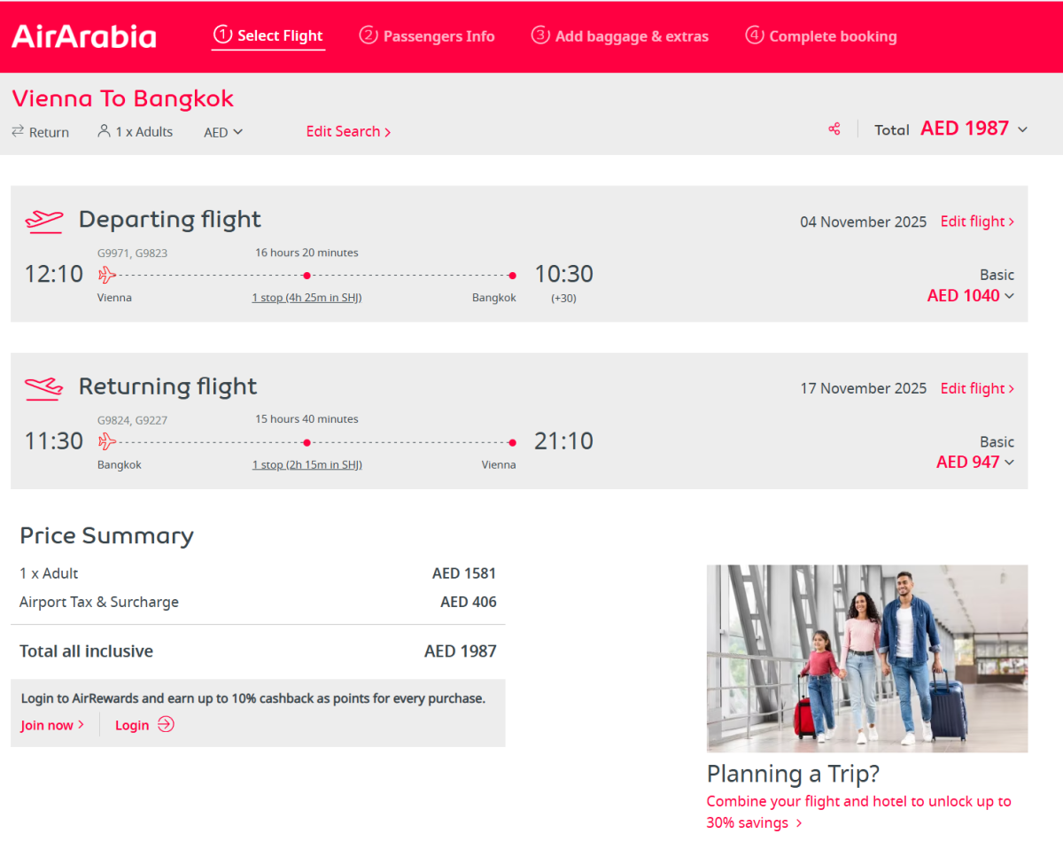 U Air Arabia jsou právě ke koupi akční letenky z Vídně s jedním přestupem v Šardžá do thajských měst již od 1 987 AED.