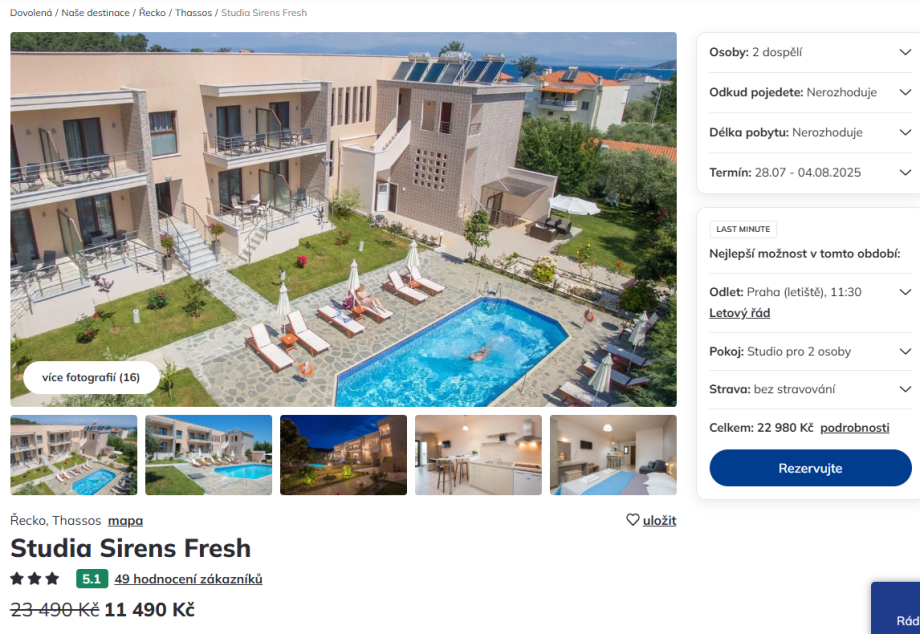 Týdenní dovolená na Thassosu z Prahy ve studiu s kuchyňkou. Zájezd od 11 490 Kč
