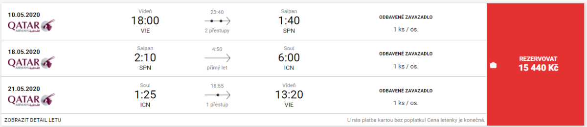 S dnešní akcí aerolinek Qatar Airways a Asiana Airlines zpozorní milovníci netradičních destinací, teplého počasí, exotických pláží i bohatého podmořského života. Zpáteční letenky z Vídně na tichomořské souostroví Severní Mariany (ostrov Saipan) aktuálně pořídíte za 15 091 Kč na období od března do června. Za příplatek 350 Kč navíc můžete zvolit na zpáteční cestě prakticky libovolně dlouhý stopover v jihokorejském Soulu.
