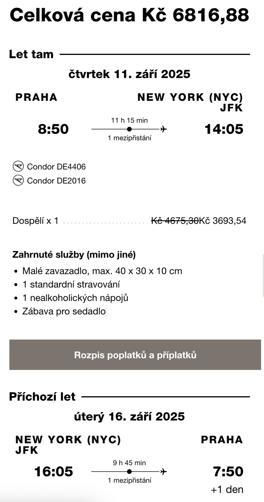 Na měsíc září aktuálně uvolnila aerolinka Condor výhodné letenky z Prahy do Ameriky. Konkrétně můžete ulovit levné zpáteční lety např. do New Yorku za 6 816 Kč na vícero termínů.