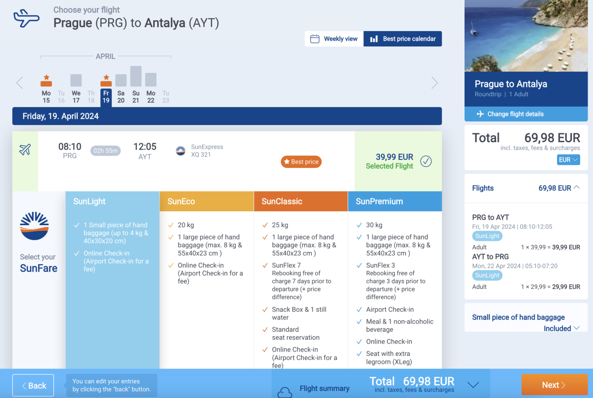 Levné letenky pro individuální cestovatele směrem do tureckého letoviska Antalya si připravila letecká společnost SunEsxpress. Zpáteční letenky v druhé polovině dubna pořídíte za 70 EUR, a to klidně na prodloužený víkend od pátku do pondělí.