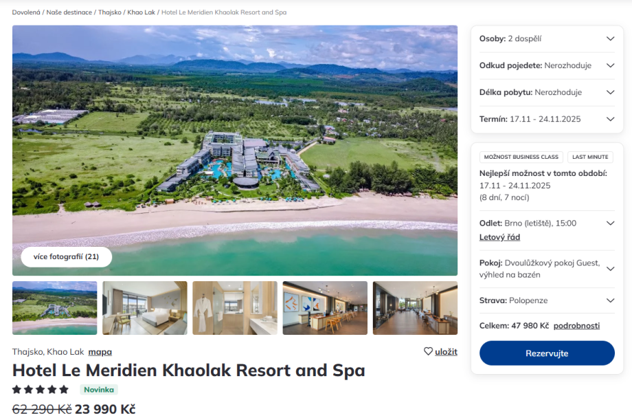 CK Čedok přichází s ještě výhodnější nabídkou zájezdu do Thajska, a to konkrétně do luxusního 5* hotelu Le Meridien Khaolak Resort and Spa. Týdenní pobyt s polopenzí v termínu 17.11. – 24.11. vychází na 23 990 Kč na osobu.