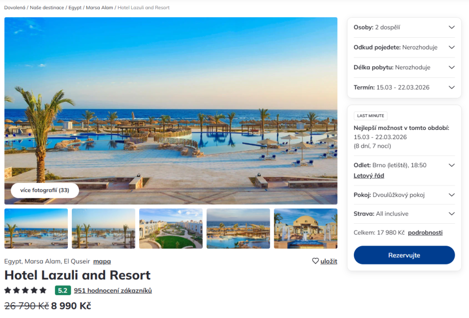 Cestovní kancelář Čedok aktuálně nabízí týdenní zájezd z Brna do egyptského letoviska Marsa Alam s ubytováním v 5* hotelu Lazuli Resort za akční cenu 8 990 Kč v termínu 15.3. – 22.3.