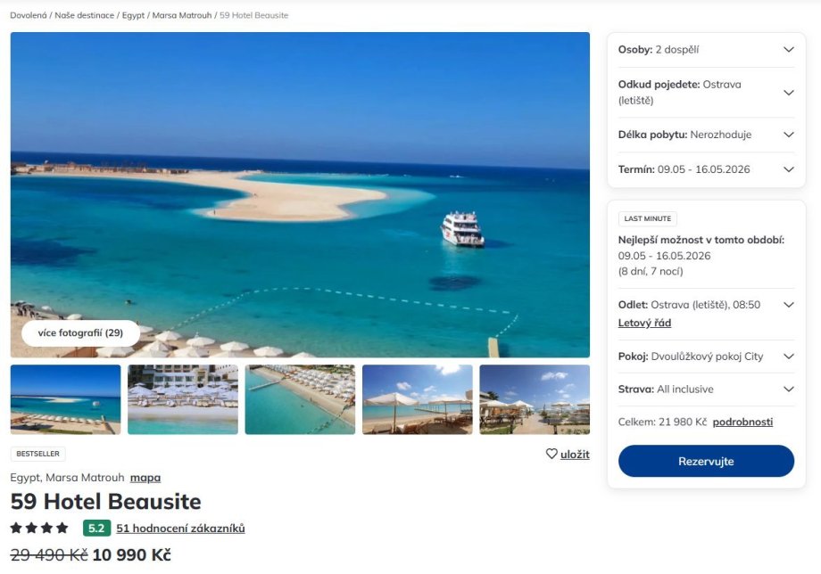 Zajímavou akci nabízí cestovní kancelář Čedok na zájezd do egyptské oblasti Marsa Matrouh s odletem z Ostravy. V termínu 9.5. – 16.5. můžete vyrazit na týdenní pobyt do hotelu 59 Hotel Beausite **** za cenu 10 990 Kč. Hotel se nachází přímo u písečné pláže.