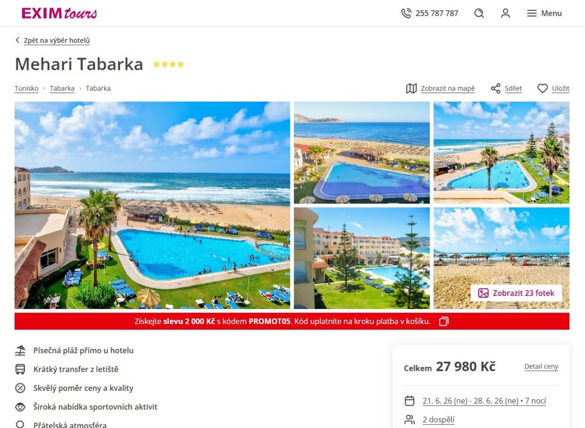 Naplánujte si dovolenou v Tunisku s cestovními kancelářemi EXIM tours a Fischer a využijte promo kód PROMOT05, se kterým získáte slevu 2 000 Kč na zájezdy do Tuniska.