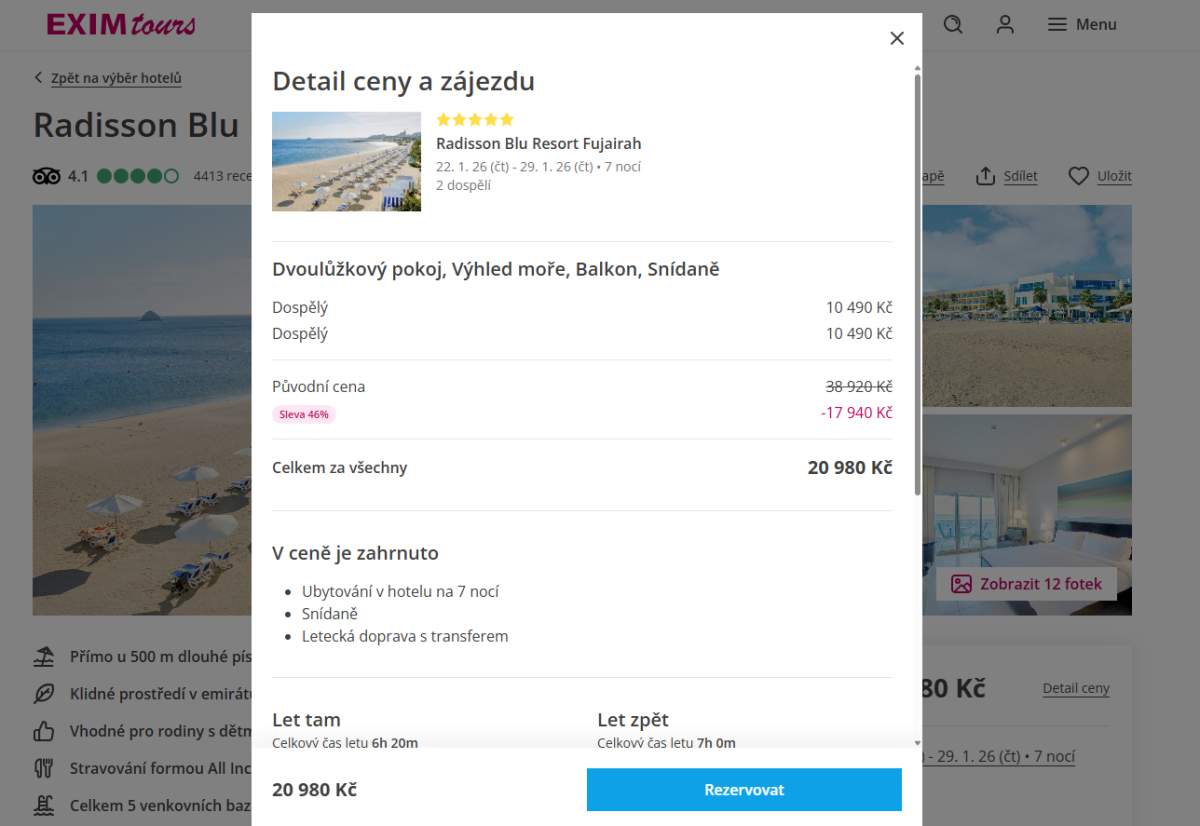 Cestovní kanceláře EXIM Tours a Fischer nabízejí týdenní zájezd se snídaní do letoviska Fujairah ve Spojených arabských emirátech za 10 490 Kč/os. v termínu 22.–29. ledna.