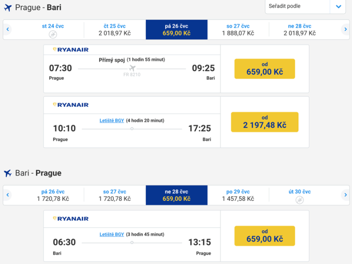 Na několik červencových termínů můžete aktuálně zakoupit nejlevnější prázdninové letenky mezi Prahou a italským regionem Apulie s hlavním přístavním městem Bari. Letenky nabízí Ryanair od 1 318 Kč s tím, že většina letů je s jedním krátkým přestupem v Bergamu. Přestup je garantovaný a v ceně je navíc přednostní nástup včetně 2 příručních zavazadel.