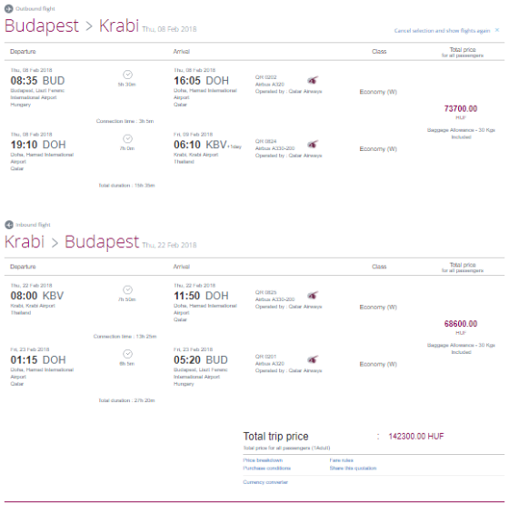 Akční letenky s nejlepší aerolinkou roku 2016, 5* Qatar Airways, jsou dostupné z Budapešti v průběhu listopadu až března (kromě Vánoc a Nového roku) za nejnižší cenu 142.300 HUF / 11.805 Kč / 457 €.