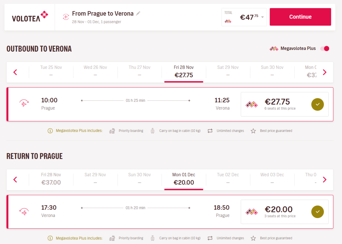 Megavolotea ceny: Při nákupu letenek zvolte ceny se členstvím Megavolotea, které následně v administraci u aerolinky ihned zrušíte. Členství se pro tuzemské cestovatele nevyplatí, ale aerolinka umožňuje nákup na 15 dní na zkoušku. Letenky za nižší cenu vám zůstanou, ale další benefity se zruší.